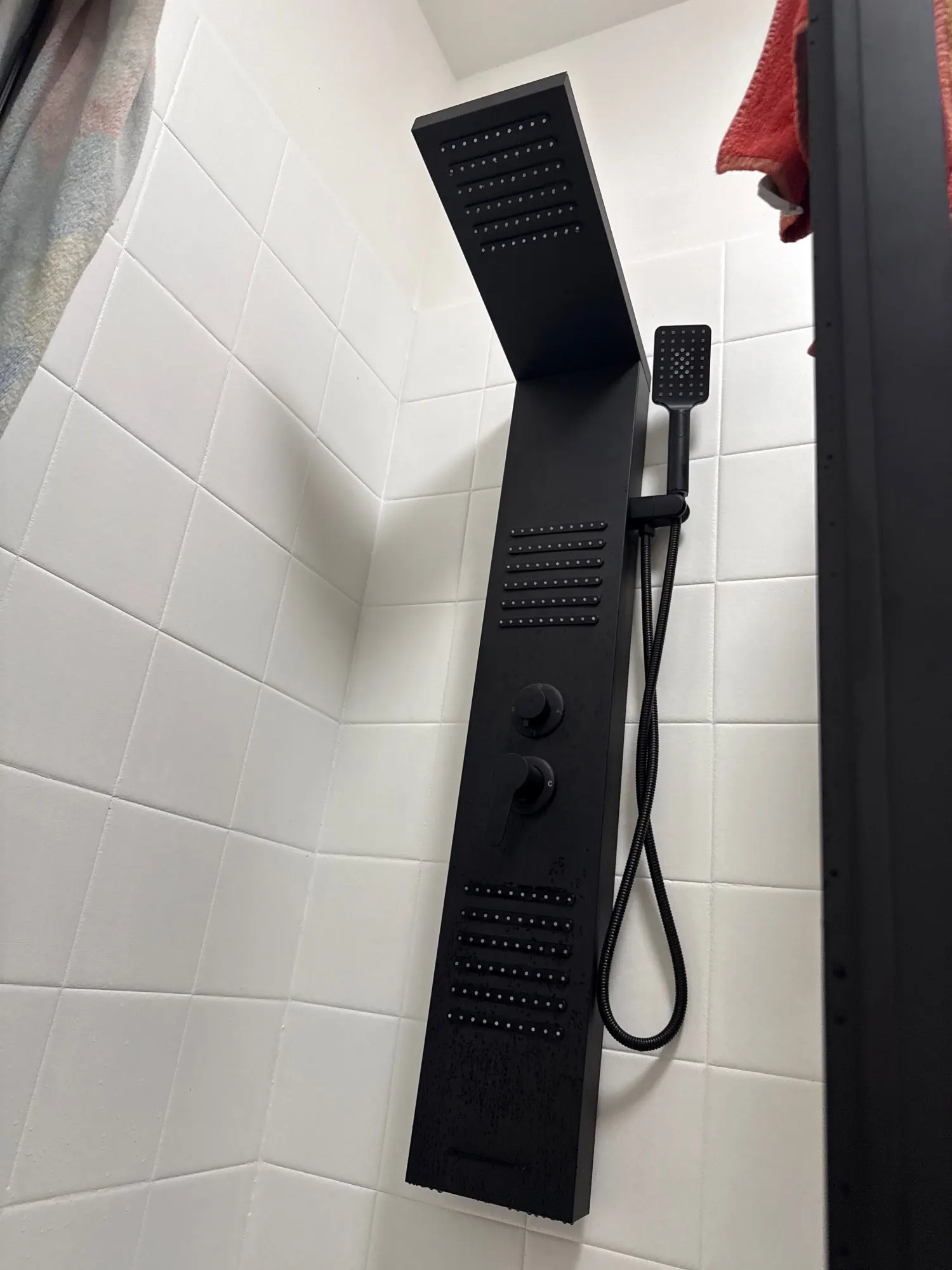 Profondeur du bras : Le bras de douche supérieur s'avance de 46 cm, offrant un espace confortable sous le jet.