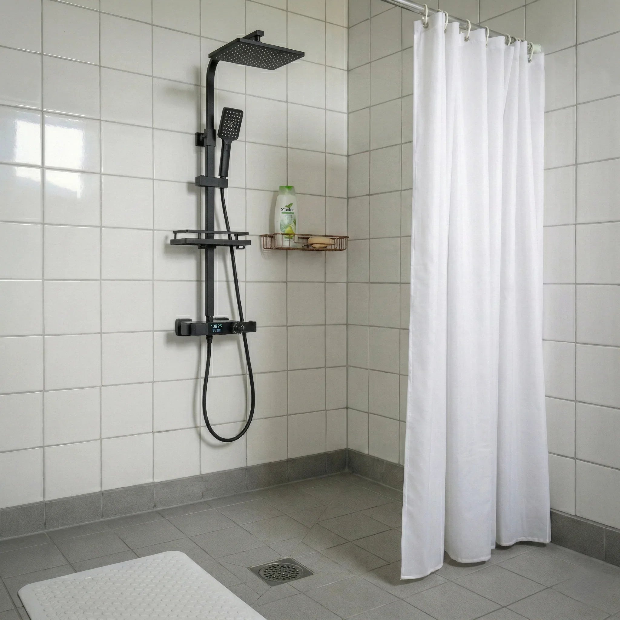 Ce système de douche arbore un design moderne et structuré avec une finition en acier inoxydable poli d'un éclat miroir. La colonne se compose d'une barre coulissante verticale fine qui supporte un large pommeau de douche supérieur rectangulaire aux angles arrondis, ainsi qu'une douchette à main géométrique assortie. Le bloc de commande principal intègre un écran digital LCD affichant la température en temps réel, flanqué de molettes de contrôle ergonomiques. L'ensemble est complété par une étagère de rangement intégrée pratique et des buses de sortie d'eau au fini gris mat, créant un contraste visuel élégant avec le corps chromé du système.