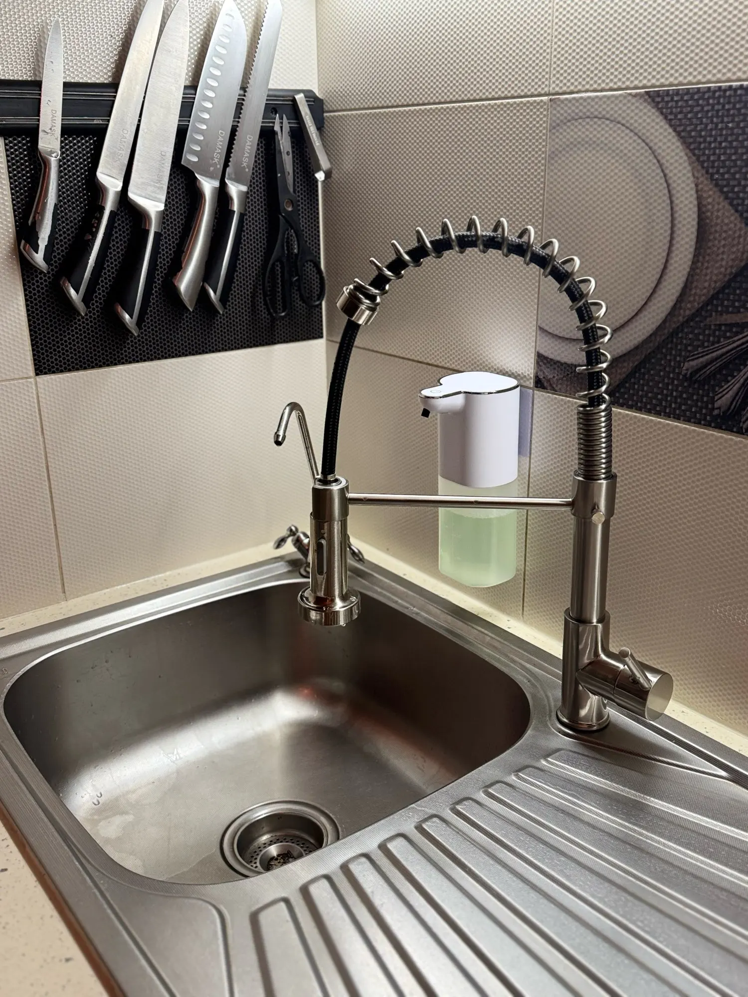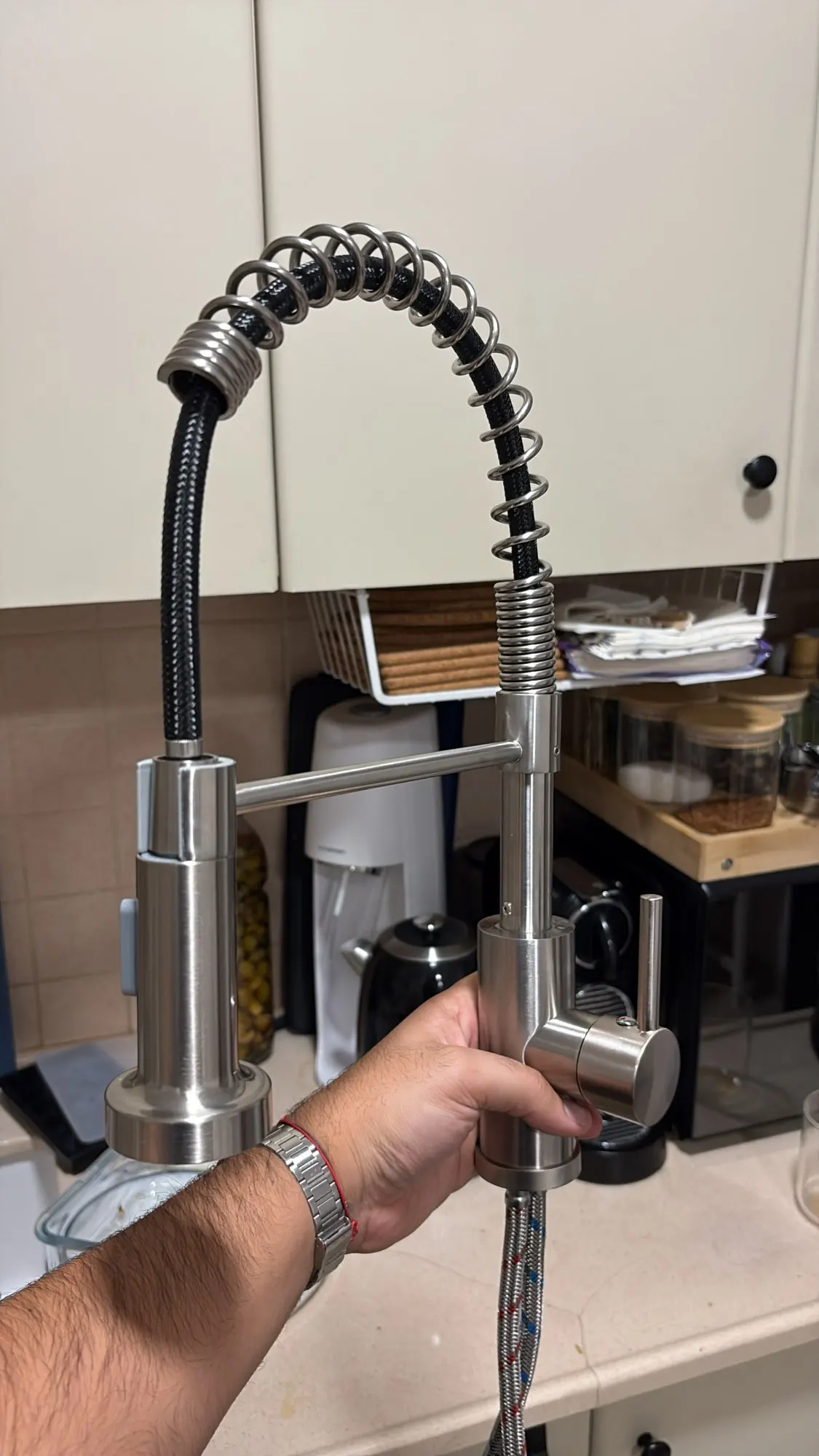 Ce robinet de cuisine adopte un style contemporain marqué par une silhouette en col de cygne élégante et structurée. Son design se caractérise par un ressort hélicoïdal apparent qui entoure le flexible, conférant à l'ensemble un aspect semi-professionnel très recherché. La base cylindrique épurée supporte une poignée latérale fine et une tête de douchette ergonomique, créant un équilibre parfait entre robustesse et finesse visuelle.